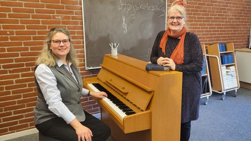 Korleder og organist Mirjam Lumholdt sidder ved det skønne flygel i sognegården.