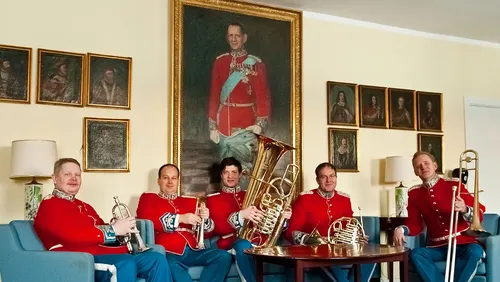 Taffelmusik ved kongehuset præsenteret med små anekdoter fra de spændende rejser ved kongelige statslige besøg i udlandet. Musikerne er medlemmer af Den Kongelige Livgardes Musikkorps.